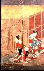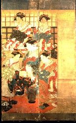 この屏風には署名はないが、顔の描き方や容姿の筆勢から、歌川豊春による天明年間(1781〜89)初期の作品に違いないと言われている。豊春が描いた掛け軸の肉筆浮世絵は多く知られているが、この様な六曲屏風は他に残っていない。